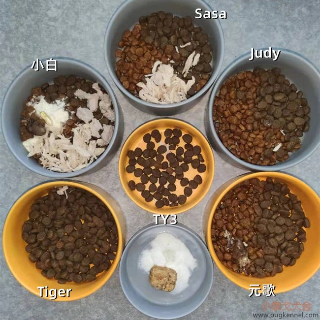 请注意每只狗的营养保健品后面一个“等”字,不便于完整叙述添加的是哪些维生素矿物质等!!